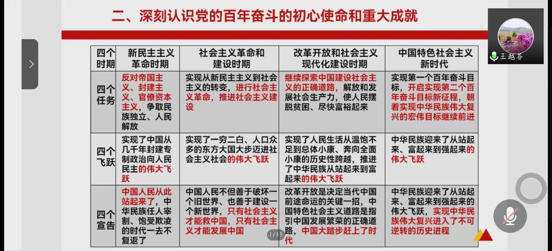 2021年12月17日,以材料团委全体成员、各团支部书记、副书记、组织委员及宣传委员为代表的团员们参加了由马克思主义学院王越芬老师讲授的以《深刻认识党的百年奋斗成就,再创新辉煌》为主题的讲座。在本次集中学习过程中,王越芬老师从以下三个方面为我们讲授了中国共产党第十九届中央委员会第六次全体会议精神。