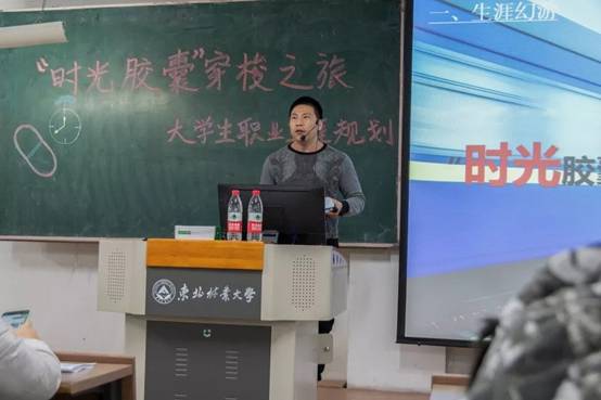 讲座开始,周洪辉老师以时光胶囊为引,从时空胶囊的填写情况发现,学生对未来职业有着不解与迷茫心理,刚刚跨入大学校门的不适应心理。针对这些心理,周洪辉老师带领学生进行了生涯幻游环节,通过对未来的描述和展望,引领学生们深入发掘内心想法,铺设人生道路,将时光胶囊里的场景进行重现。