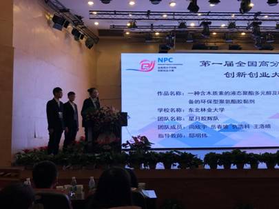 2019年11月24日下午,由四川大学承办,华南理工大学、东华大学、青岛科技大学协办的第一届“全国高分子材料创新创业大赛”(NPC大赛)决赛在成都四川大学望江校区圆满落下帷幕。我院高分子材料与工程专业“星月胶辉”代表队的参赛项目《一种含木质素的液态聚酯多元醇及利用其制备的环保型聚氨酯胶黏剂》最终在进入决赛的40支队伍中名列第22名,获得优秀奖。