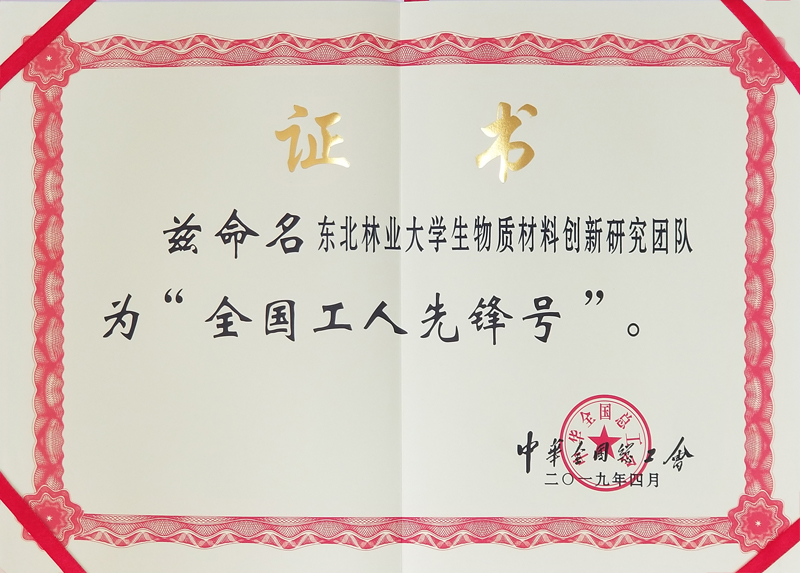 4月23日,在北京人民大会堂举行的2019年庆祝“五一”国际劳动节暨全国五一劳动奖和全国工人先锋号表彰大会上,92个集体和695名个人获全国五一劳动奖状、奖章,797个集体获全国工人先锋号,生物质材料研究创新团队获“全国工人先锋号”。