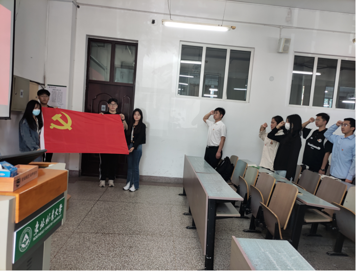 活动最后,在李鹏昭老师的带领下,全体党员重温了入党誓词,全体参会人员整齐列队,精神饱满、庄严的举起右拳,面向党旗庄严宣誓。誓言声声掷地,回响于教室之中,在场的每一名同志都深受感染、热血澎湃。誓言字字千钧,表达了全体党员对党的忠诚和坚定,诠释了他们建功新时代的迫切愿望!