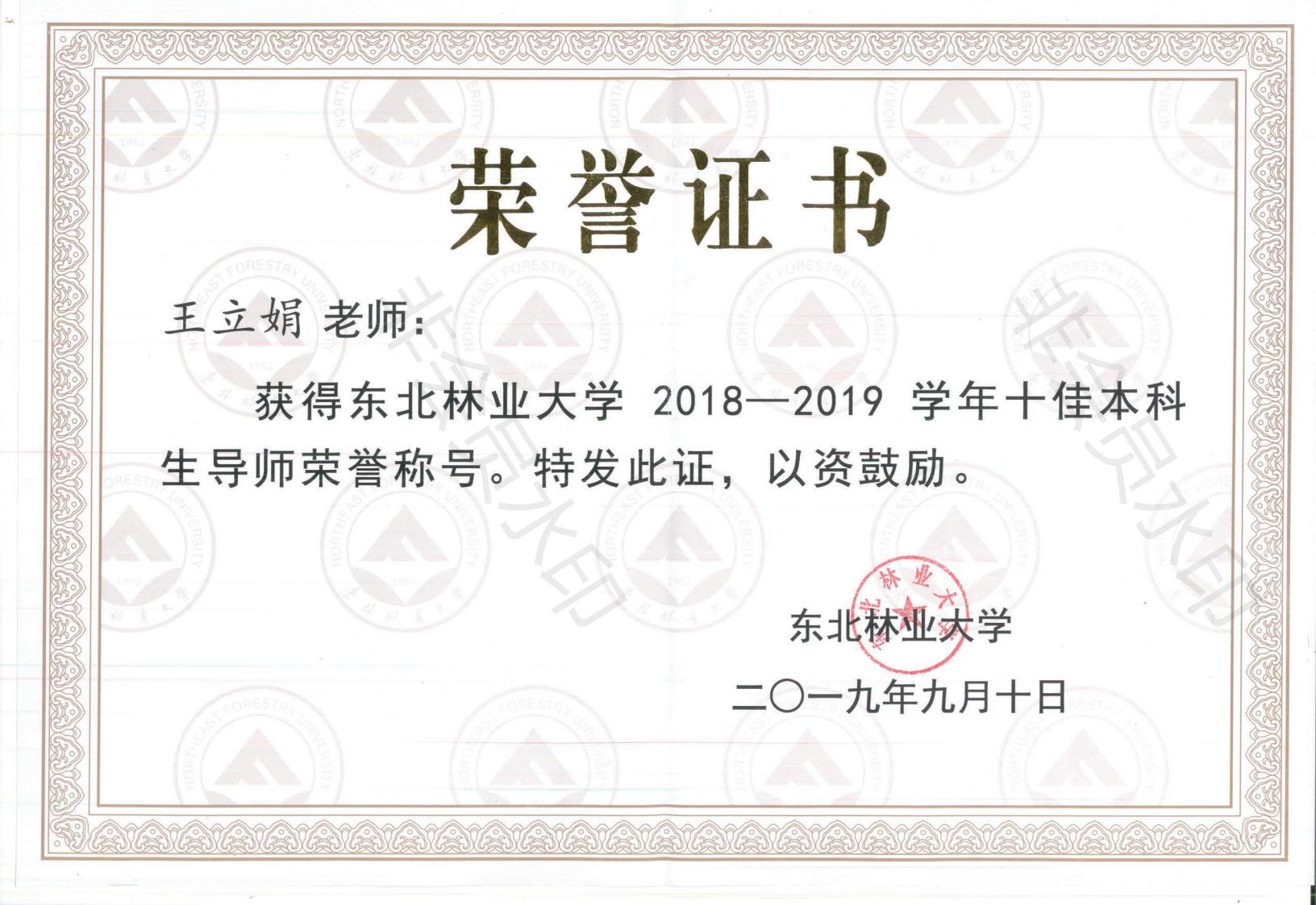 东北林业大学2018-2019学年十佳本科生导师荣誉称号(王立娟)