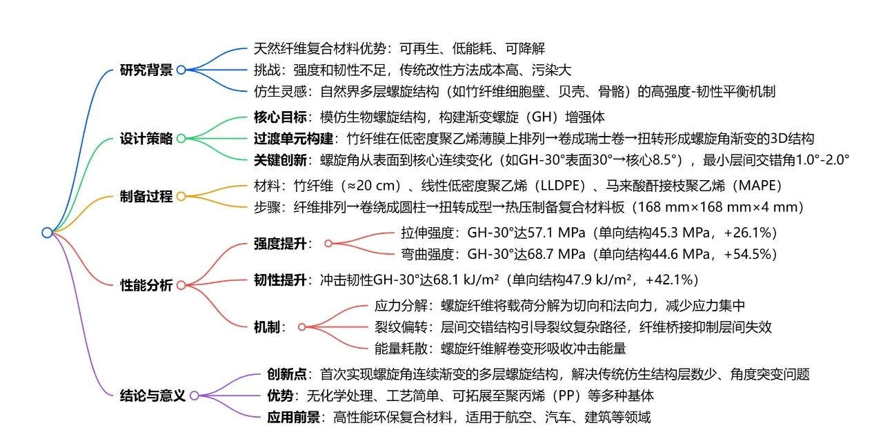 2.仿生灵感自然界多层螺旋结构(如竹纤维细胞壁的18层同心圆微纤,螺旋角3°-45°;贝壳、骨骼的螺旋纤维)通过应力分解和裂纹偏转实现高强度与韧性平衡。