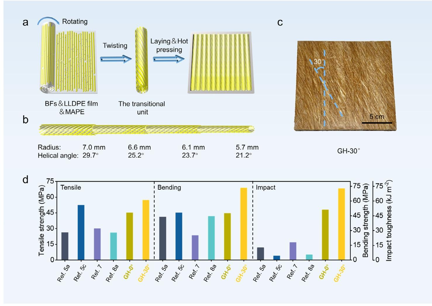 制备工艺:材料:60%竹纤维(≈20 cm)、36% LLDPE、4% MAPE(增容剂)。步骤:纤维排列→卷绕成圆柱(14 mm直径)→扭转成型→热压(140°C,7 MPa,7 min)→冷却得到4 mm厚板材。