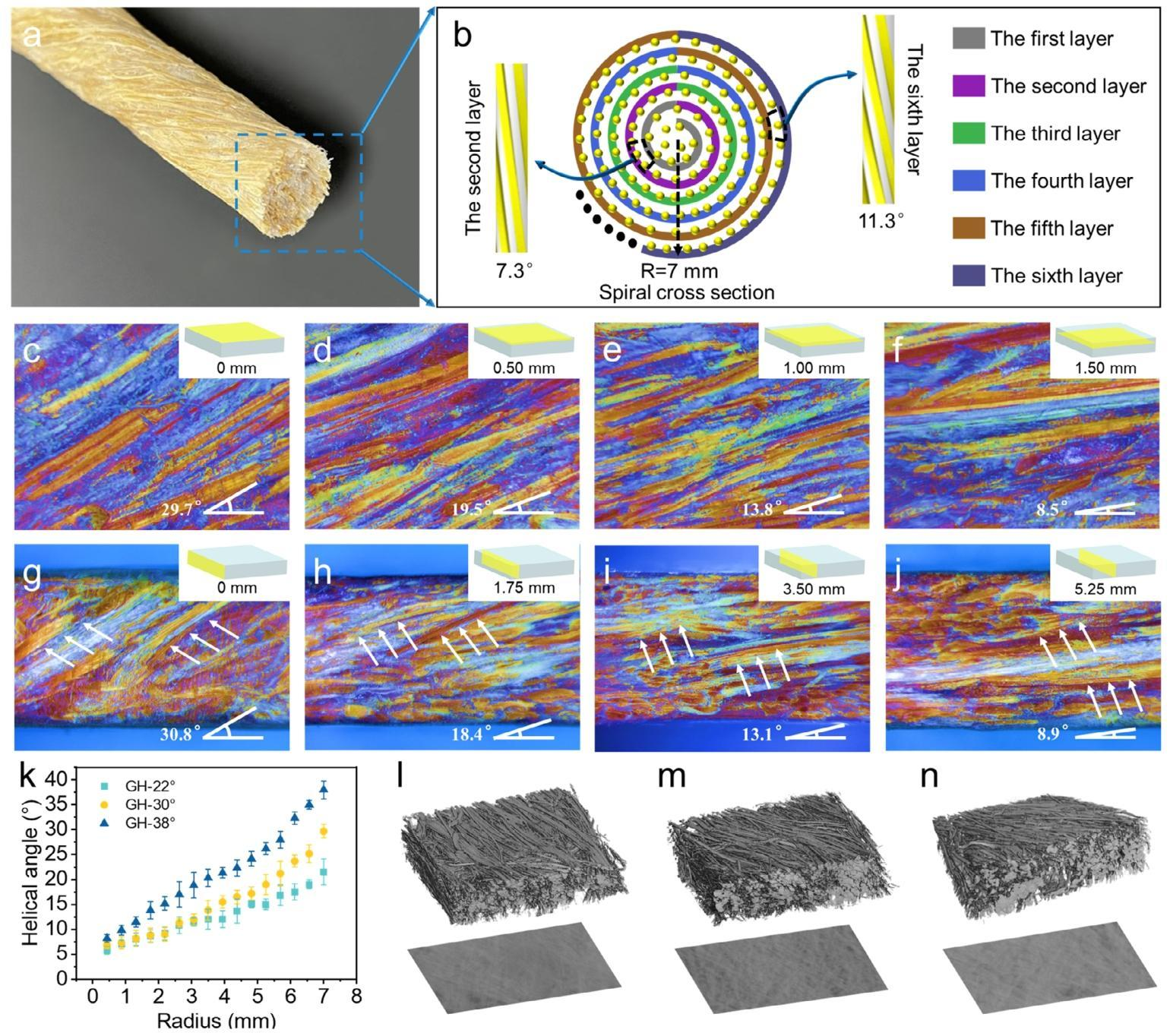 过渡单元和所得复合材料的结构表征 (13.5×13.5×4 mm)。a)GH-30° 的代表性过渡单元的数字图像。b) 过渡单元的横截面示意图,显示BF的连续螺旋分布和逐渐变化的螺旋角。c-f) 不同深度的GH-30° 复合板的俯视图。具体来说,(c-f) 分别对应于顶面下方0、0.50、1.00和1.50 mm的位置。g-j)。GH-30° 复合板在不同位置的侧视图。(g–j) 分别对应于0、1.75、3.50和5.25 mm处的侧面位置。k) 过渡单元内不同径向位置的螺旋角。l-n)3D地形重建以及 (l)GH-22°、(m)GH-30° 和 (n)GH-38° 的相应X射线投影图像。