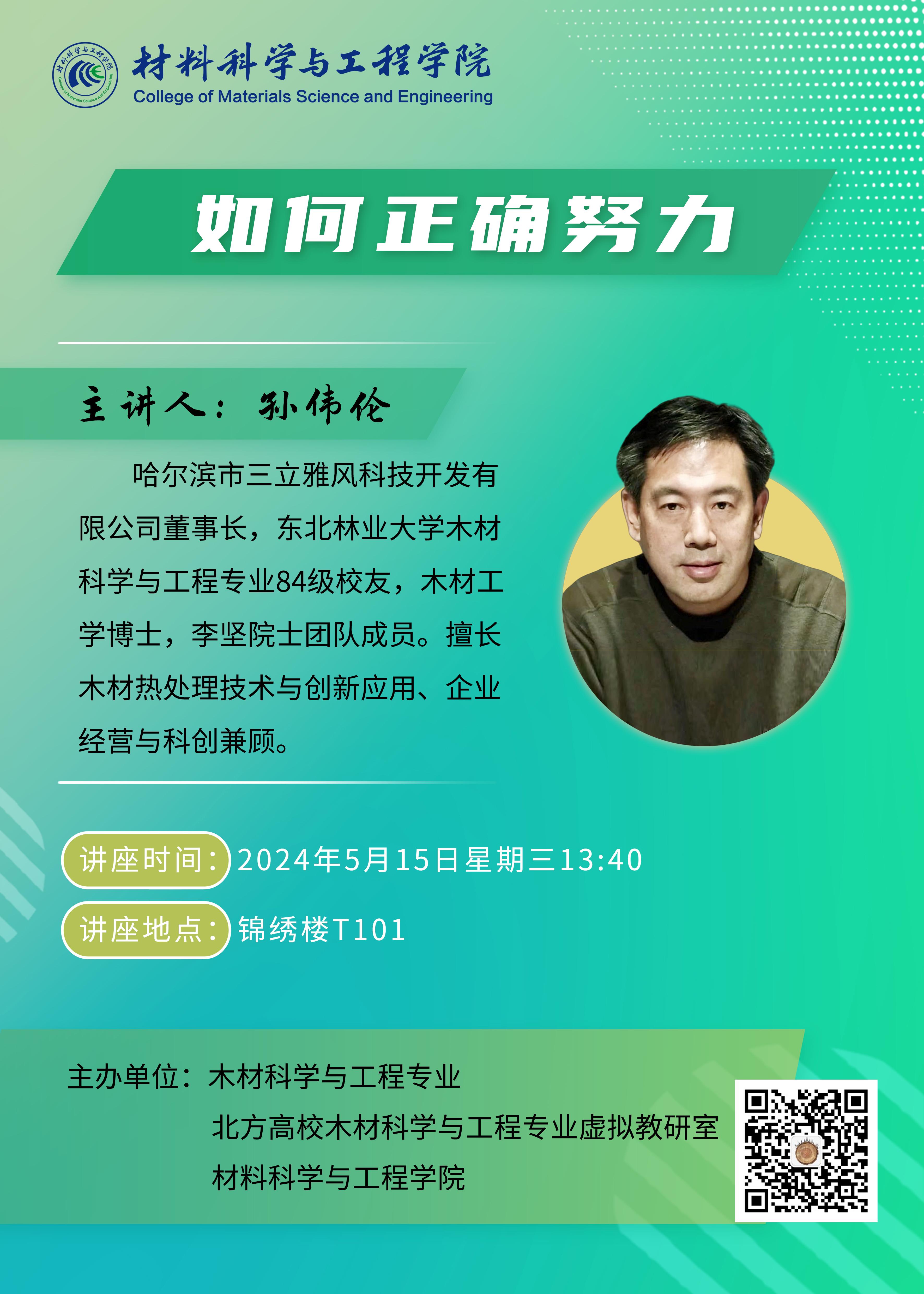 嘉宾简介:孙伟伦,哈尔滨市三立雅风科技开发有限公司董事长,东北林业大学木材科学与工程专业84级校友,木材工学博士,李坚院士团队成员。擅长木材热处理技术与创新应用、企业经营与科创兼顾。